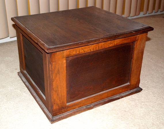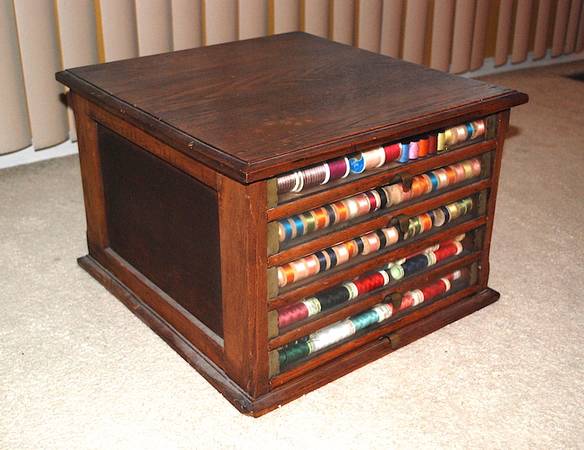 13" Wide x 18" Depth x 12 "High. Made to hold spools of thread in general stores about 1880, this solid oak spool chest has 5 drawers. Fully functioning, nice finish and condition, original pulls, one drawer pull missing. All thread spools included.