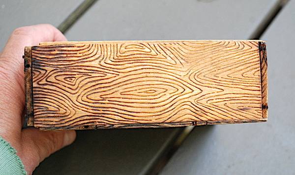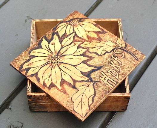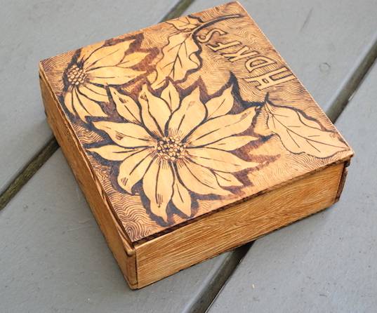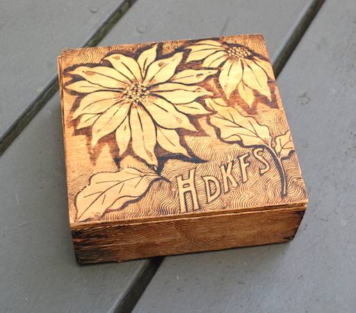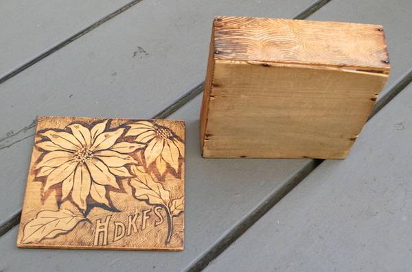 Pyrography decoration. Showing normal aging but clean and sound. Measures 6" X 6" and is 2" deep.