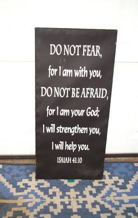 Wall hanging inspirational bible verse DO NOT FEAR...Isaiah 41:10. On canvas. Wood frame. Looks to be custom made art. Measures aprox 14" length x 1/2" thick x 29 14/16" height. Pick up from Villa Park. Please call or text show contact info