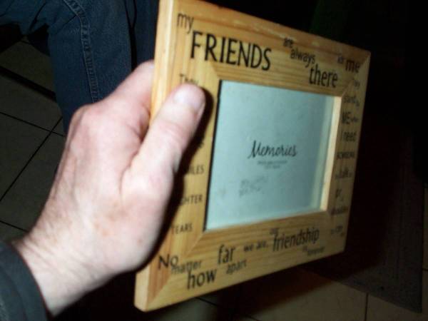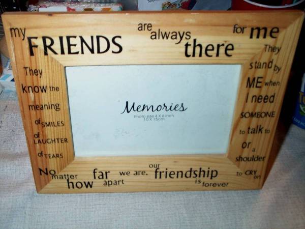 Vintage Target Store self standing wood frame Item 0491. "MY FRIENDS ARE ALWAYS THERE FOR ME". Frame measures aprox 8 10/16" length x 6 10/16" height. Accommodates a 4" x 6" picture. Pick up from Villa Park. Please call or text show contact info