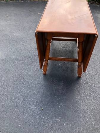 Nice sturdy solid wood drop leaf table with drawer, surface scratches, otherwise great condition. 46” x 54” with leaves up. Would make a nice farmhouse piece. $100.00 cash