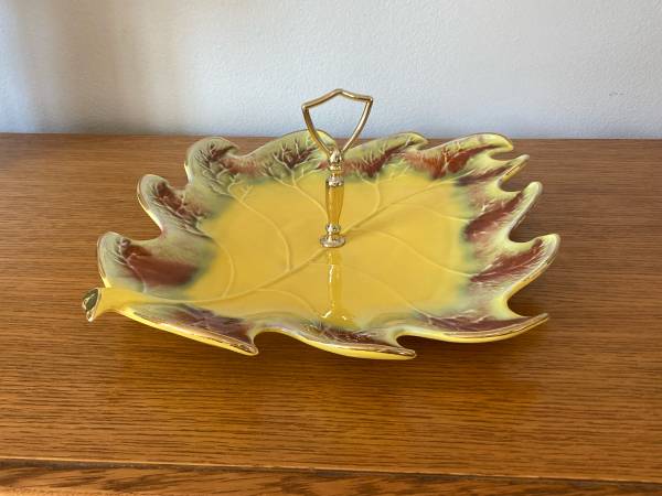 Vintage 1950s mid century #803 California Pottery 12" leaf-shaped ceramic serving tidbit tray with gold finial handle. Glazed in bright yellow, rust and sage green colors, reminiscent of a large Fall leaf. Perfect for cookies, snacks, sandwiches, candy, appetizers, hor d’ourves, desserts. Excellent condition. No chips or cracks. Made in the USA.