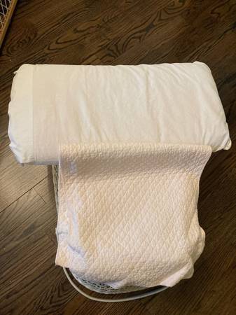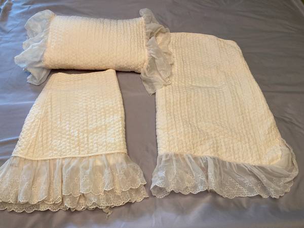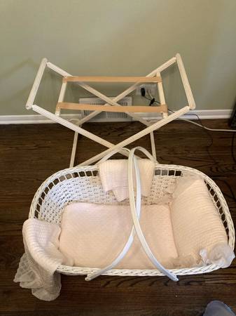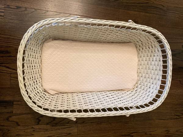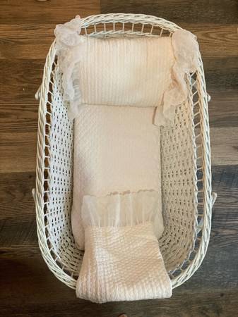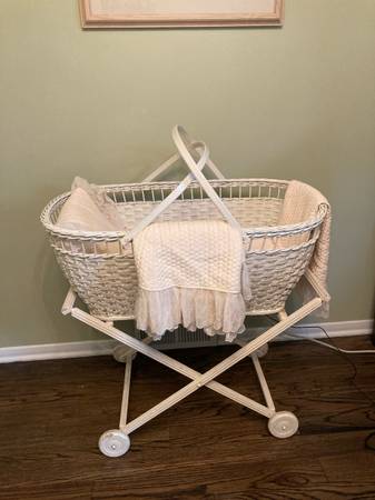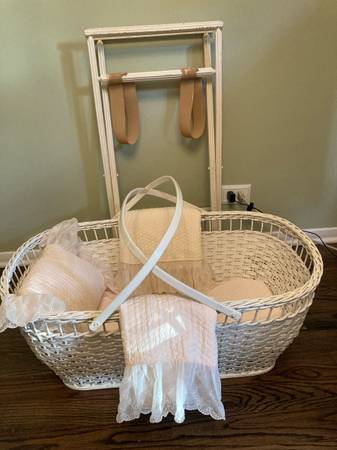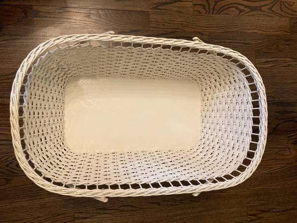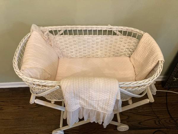 This antique wicker bassinet was mine from the late 1950s! It has two wooden carrying handles for easy transport and is on a wheeled folding wooden stand for mobility and storage. Sturdy enough for a supervised infant but can also display dolls, stuffed animals, toys, flowers or even use for pets as a dog or cat bed! Also perfect as decor or to hold gifts at a baby shower or other infant celebration and would add a touch of nostalgia to any room or infant photography shoot! A photographer’s dream! Includes plastic-covered mattress, mattress cover, pillow and pale pink accessories including a cotton quilted blanket, decorative ruffled and quilted pillow sham, top cover and skirt. Basket measures 32”Lx 19”W x 12”H (30”H on stand). Basket might seem large but it is very lightweight and manageable. The white painted wicker is thick and sturdy and in excellent shape with no holes or breaks and all wheels are intact and move smoothly. Clean and from non-smoking environment. All accessories have been recently washed.