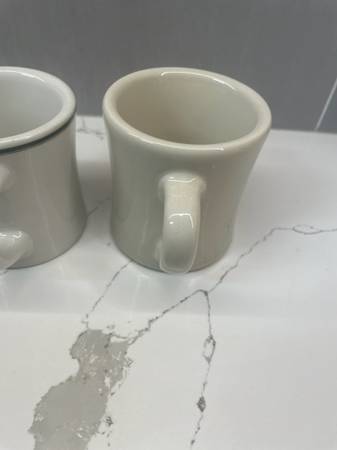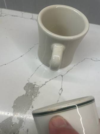 2 Victor Mugs-One restaurant ware, other plain ivory. Restaurant ware piece has a paint scratch, see pic with my finger pointing it out.