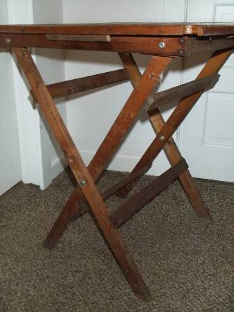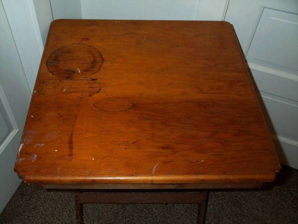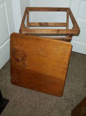 Antique compact size desk. Removeable top as pictured. Oak color wood. A few marks on top. Looks to be custom made. Desk came from a ladies house that was over one hundred years old...I am estimating this desk is about 90 years old. Measures aprox 25" wide x 25" deep x 28 1/2" height. Pick up from North Aurora, IL. Please call or text show contact info
