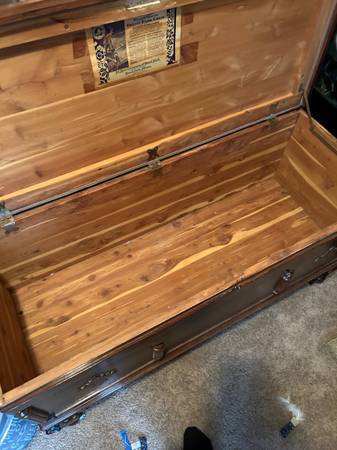 This Hope chest was made in Franklin Park Illinois under the president Edward Roos Junior. It was made between 1918 and 1943. It is made completely out of cedar. Handmade. Only stained once.