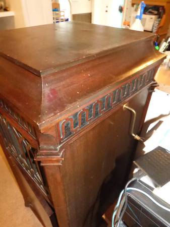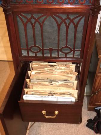 Very good working condition, includes over 2 drawers of Edison Diamond disc records and aother crate for over 60 Edison thick records, most have original paper record sleeves. Phonograph has original rare index cards unfilled. Cabinet has usual scuffs and ware marks.
