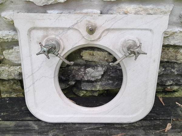 I have for sale a vintage bathroom vanity top with separate faucets for hot and cold. The top needs a cleaning. The faucets are corroded and untested. The top measures approximately 24 inches wide, 20 inches from front to back, and has an 11 3/4 inch round opening for a sink.
