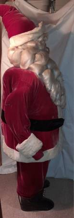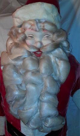 I have for sale a vintage Santa figure. He measures approximately 5' 3" to the top of his hat. His right arm is thinner and feels like wood and as though it is on a pivot. I was told he used to wave at one point. He came from an old pharmacy that closed down.