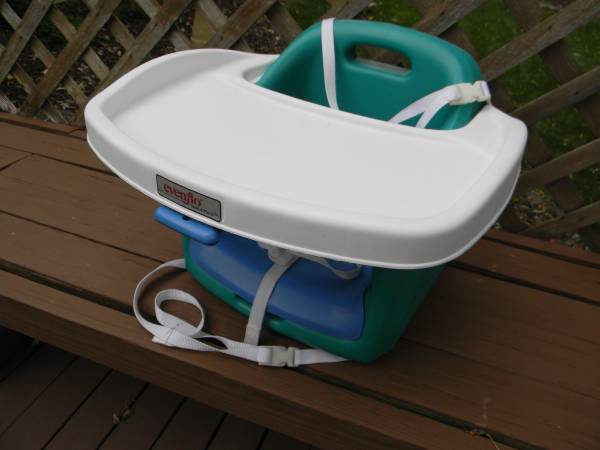 Adjustable height seat with tray for small child to sit at the table using the tray or the table to eat or play. Evenflo Snack and PlayII, model 291.02-1 (instructions on bottom label). Strap included to secure to the chair. $25. Potty by The First Years. Red, white and Blue. $15. These items have been sanitized and used only a few times when grand kid visited some years ago. These items should be great for the first child. Makes a great gift for a friend.