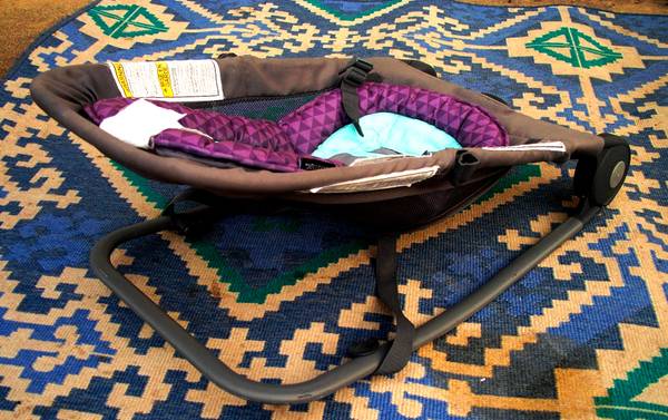 Portable baby seat made by Summer Infant. Reg. No. PA-29801 (CN). Folds flat for storage and easy transport. There is a vibrator machine on the bottom though there is no batteries in it. Measures aprox 15 1/4" length x 28" deep x 13" height. Gray, purple and blue type colors. Pick up from Villa Park. Please call or text show contact info