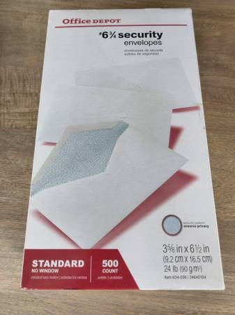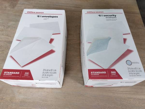 Brand New #6 3/4 Envelopes. 500 in each box. One box has security envelopes, one box has standard envelopes. They measure 6 1/2" x 3 5/8" 1000 total envelopes. $10 per box. Call or text Bob: