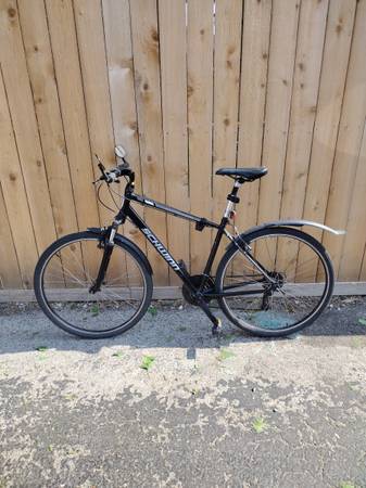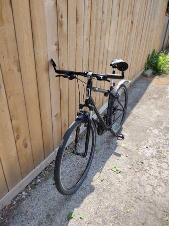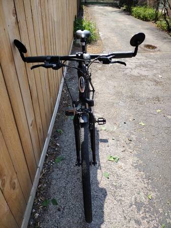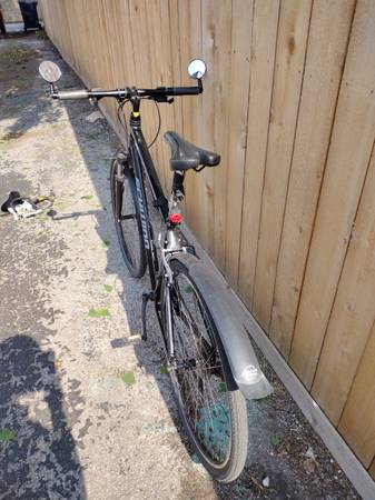 This hybrid bike with a flat handlebar, tubular tires, and a grip shifter is in great working condition. Rack comes with the bike which is really helpful for transporting some items around. I also put mirrors on both sides, which helps safely move around the city.