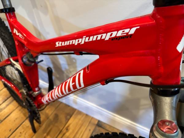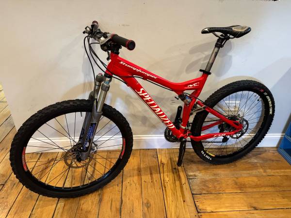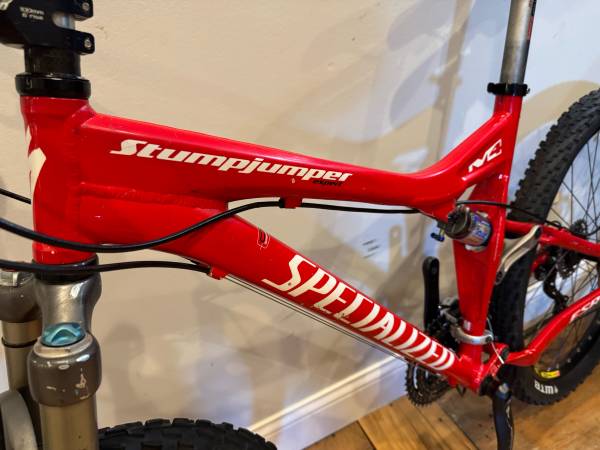 Specialized Stumpjumper FSR M4 Full Suspension mountains bike. This is a medium frame and I believe this is a 2007 or 2008 model year. The frame has no dents or cracks, but does have nicks and scratches, which most have been touched up with paint. Pivots are tight, both shocks rebound well. This comes with a 27 speed Shimano XT / LX drivetrain. Tires have plenty of tread and just threw on some new locking grips.