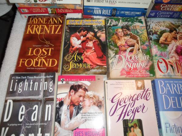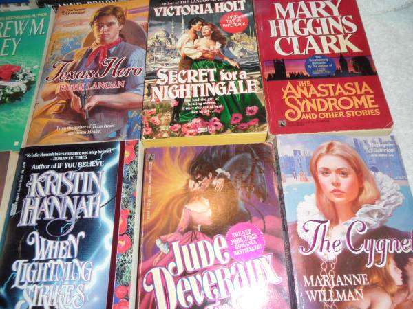 This is a lot of 54 paperback romance novels from my mother's estate. There is many various authors and titles. All are in very good condition. The copyright dates are from 1990 thru 2005. Will sell the whole lot of 54 for $40.00, may separate for $.75 each. Please send your number along with any questions you may have, and I'll get back to you as soon as I can.