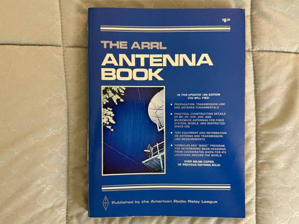 14th edition. This book covers antenna fundamentals and construction, a collection of antenna models, radio propagation, HF, VHF, UHF, mobile, portable, transmission lines, towers, and more. The book has had very minor use and has 327 pages in 16 chapters. Email for a complete list of chapters. $8