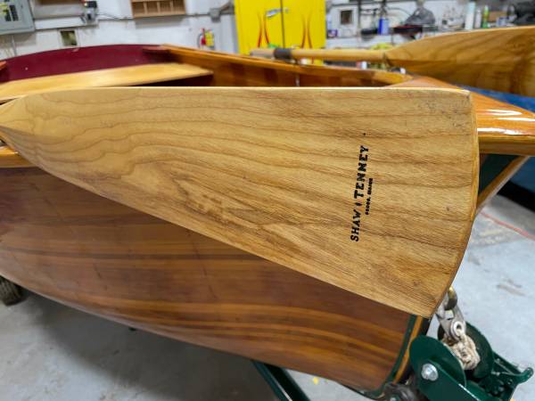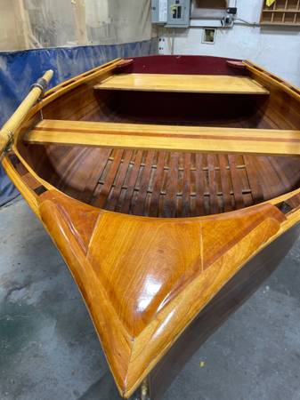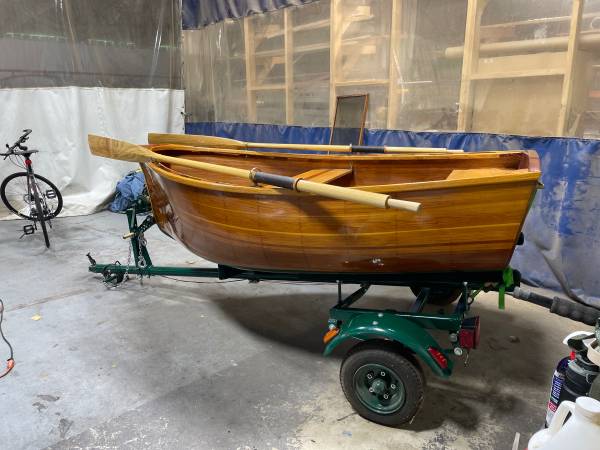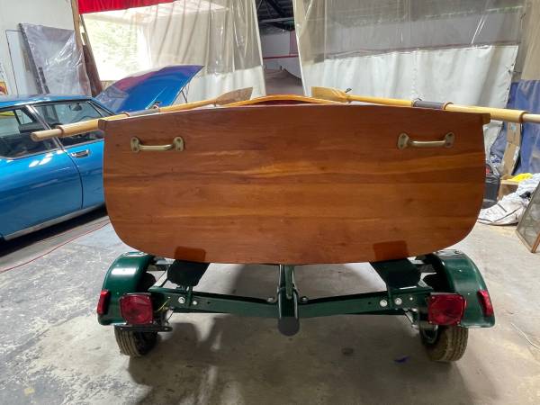 Beautiful handmade wooden boat with restored and powder-coated trailer. New Shaw and Tenney oars. Boat measures 8’8” x 5’1”.
