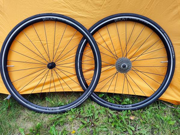 Excellent condition, lightly-used Hunt Four Season Aero wheelset with tubeless Continental GP5000S TR tires installed. Wheels and tires have traveled just 646 miles since new, and are now collecting dust. This a great combination that I really liked riding, but I built myself a set of custom wheels that I like just a little bit more, so these need a new rider.