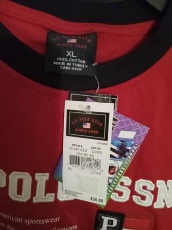 For sale are three boys 18-20 long sleeve shirts. Two of the shirts have never been worn, and I think the third shirt wasn't either. The first is a Russell athletics shirt, with number 7 on it and originally sold for $28.00 plus tax. The 2nd shirt is a navy blue jerzees, and it was definitely under 10.00. Finally is a U.S. Polo shirt that originally sold for $26.00 plus tax. About $70.00 new for the shirts, and selling them for $40.00.