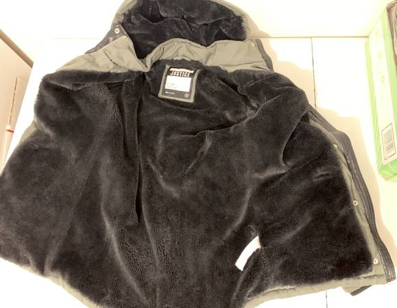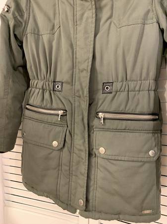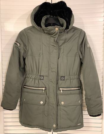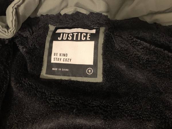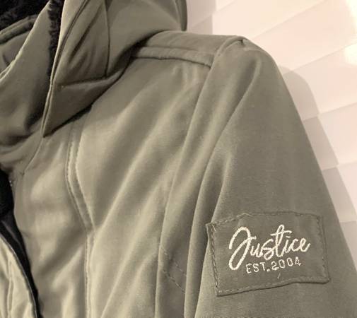 Justice Green Parka - Girls Size: 10 Youth - Full Zipper closure w/ snap flap over it - 4 front pockets (2 snap flap & 2 zipper - Elastic waste - Cozy soft/warm black faux fur lining inside...