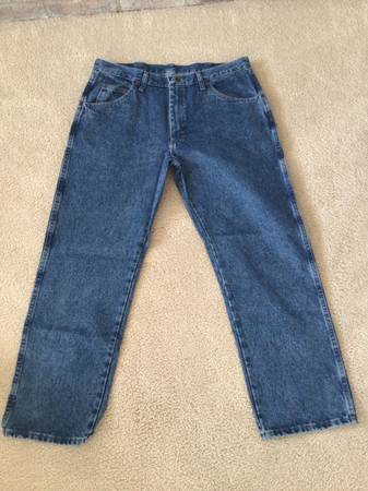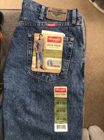 1). Wrangler Regular Fit 36x29 Premium Denim jeans. Never worn, still has all the tags, straight leg. Mom forgot she bought these as a present years ago and they stayed in a tote.