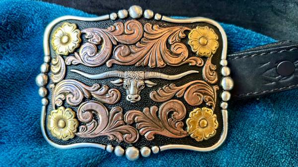Beautifully designed buckle by M&F Western Products. Scalloped edge with beaded accents with an antique silver longhorn motif and matte black background. There are gold floral accents in each corner and a scrolling pattern in copper to give a lot of interest to this buckle.