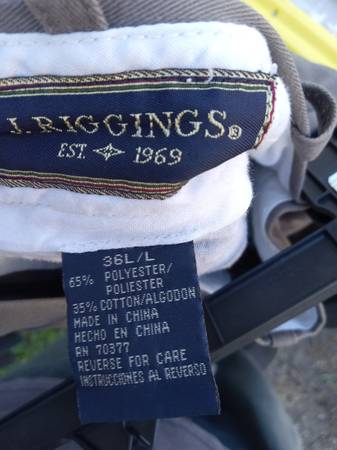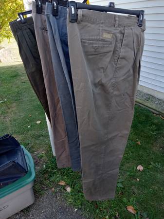For sale are 4 pair of men's 36" wide waist pants. They will no longer be needed partially due to no longer needed for job. The first two are 34" length Haggar casual pants. The next is a J.G. Riggins, and the fourth is a Bellini. Both of these are L length, are pleated and are hemmed. Material and color can be seen on all in pictures. All are in very good condition and should have plenty of life left in them. Selling all 4 pairs for $20.00.