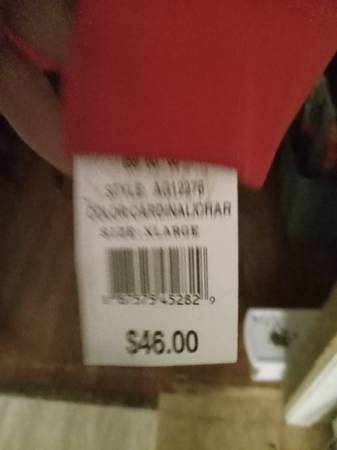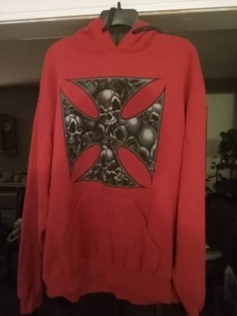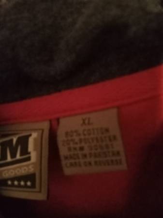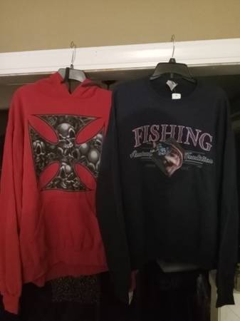 For sale are a pair of men's x large sweatshirts. They have never been worn and still have their tags on them. The 1st is a blue crew neck sweatshirt with "fishing" on the front and originally sold for 9.99 plus tax. The other is a red hooded sweatshirt with a crosslike (?) design on front and originally sold new for $46.00 plus tax. Together they originally sold new for more than $60.00 with tax and I am selling the pair for $30.00, and can provide fuller and better pictures if interested.