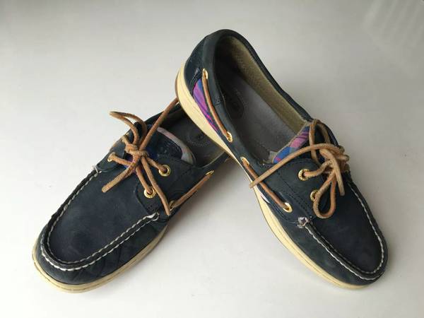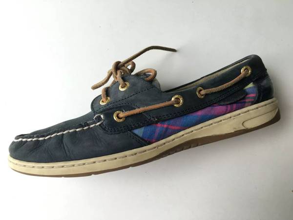 Sperry Top Sider Women's Bluefish Leather Boat Shoes Size 8.5 Color - navy blue leather upper with side insets of navy blue, red and green plaid Pick up northeast side of Wheaton