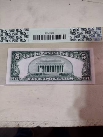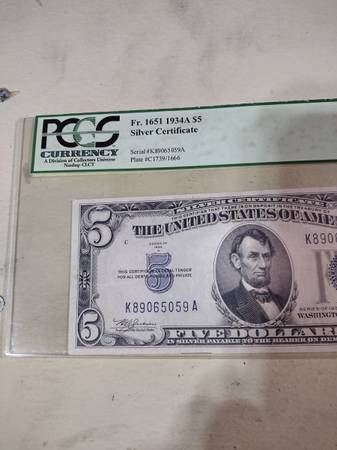 In the original currency sleeve. 1934A $5 Silver certificate, Fr. 1651 Extremely Fine 45PPQ. The Rickey Collection. Serious inquiries only please, selling for $80, price is firm. Located In Aurora...