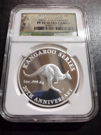 Beautiful coin, new in the original graded mint slab. 2013 Australia Silver $1 Kangaroo, 20th Anniversary. Graded perfect flawless PF 70 Ultra Cameo by NGC. 1oz fine silver coin. Serious inquiries only please, selling for $80, price is firm. Located In Aurora for pick up, contact Joe at show contact info