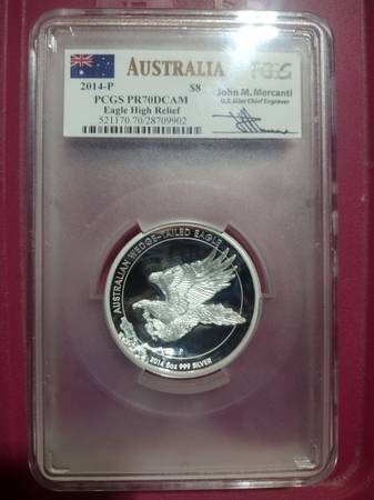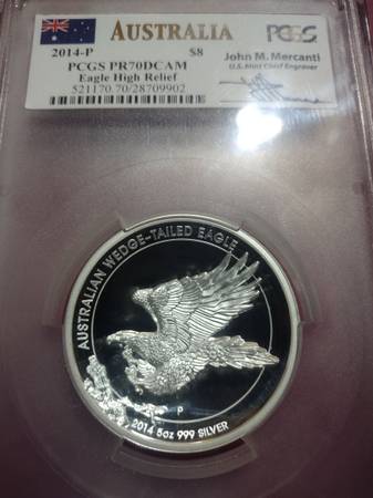 Beautiful Coin, new in the original mint slab case. 2014-P PR70DCAM High relief wedge tailed eagle $8 dollar silver proof coin, 5 oz fine silver. John Mercanti hand signed. Serious inquiries only please, price is $350, firm. Located In Aurora Illinois for pick up, will meet at the Aurora Police department. Contact Joe at show contact info