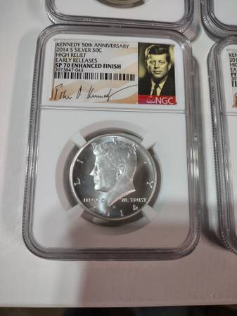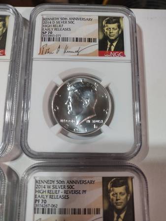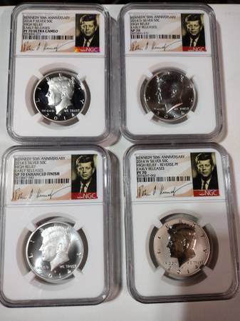 Beautiful 90 percent silver Kennedy half dollar set, new in the original graded mint slab cases. 2014 Kennedy 50th Anniversary half dollar set. Includes PF 70, SP 70 ENHANCED FINISH, PF 70 Ultra Cameo, and SP 70 - all high relief early releases. Set includes all 4 coins seen in photos. 90 percent silver. Serious inquiries only please, selling the set for $300, price is firm. Located In Aurora for pick up, contact Joe at show contact info