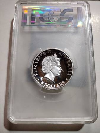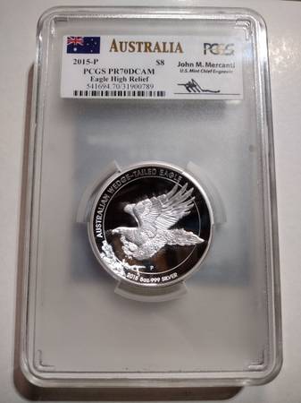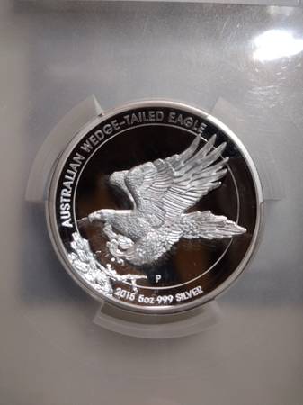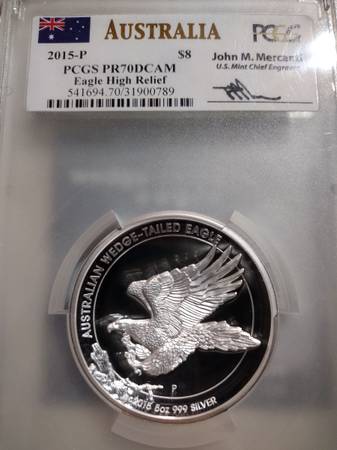 New in the original mint slab case with COA. 2015-P PCGS PR70DCAM Australian Wedge Tailed Eagle High relief silver coin - 5oz fine silver. Serious inquiries only please, selling for $375, price is firm. Located In Aurora for pick up, contact Joe at show contact info