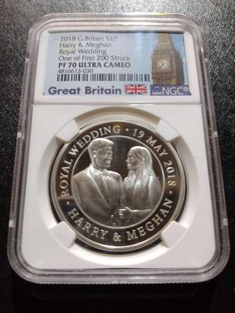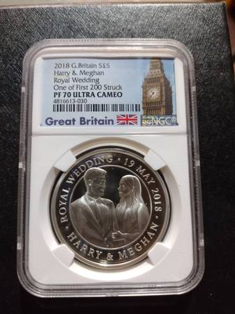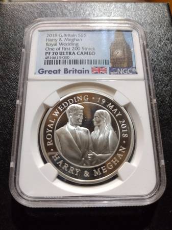 New in the original slab case. 2018 Great Britain S£5 Harry & Meghan Royal Wedding, PF 70 Ultra Cameo silver coin, one of first 200 struck. Serious inquiries only please, selling for $125, price is firm. Located In Aurora for pick up, contact Joe at show contact info