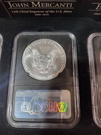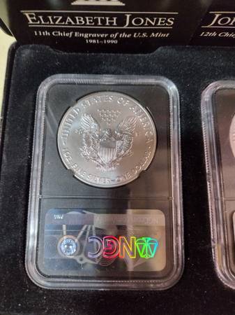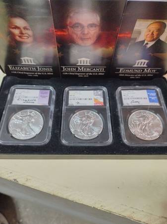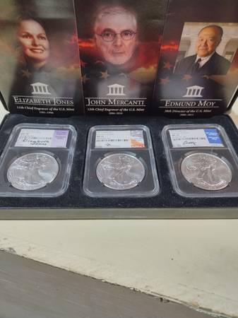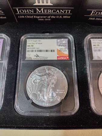 Beautiful Engravers series Silver Eagle set, new in the original graded mint slab cases and includes the storage box. 2019 Silver Eagle $1 first day of issue, graded MS 70 by NGC 3-Coin set. All are hand signed by Elizabeth Jones, John Mercanti, and Edmund Moy. Includes the 3 coins as seen in photos. Serious inquiries only please, selling the set for $425, price is firm. Located In Aurora for pick up, contact Joe at show contact info