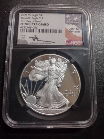 New in the original mint slab case. 2021 W Silver Eagle $1, Heraldic Eagle T-1 first day of issue, PF 70 Ultra Cameo. John Mercanti hand signed, the last silver Eagle with Mercanti's design and signature. Serious inquiries only please, selling for $475, price is firm. Located In Aurora for pick up, contact Joe at show contact info