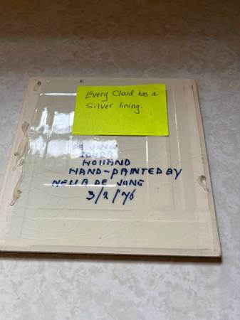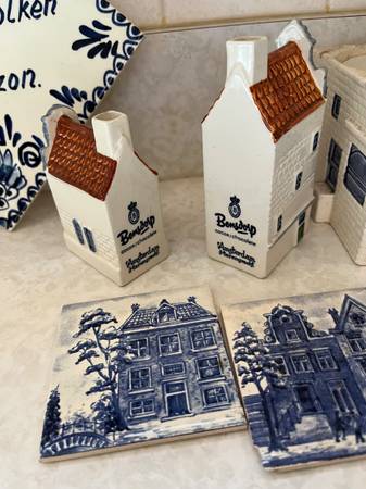 Planter, plaques, cocoa containers, trivet, Welcome plaque, small blue glass lantern. $10 for all.