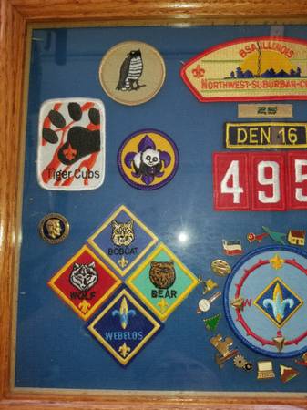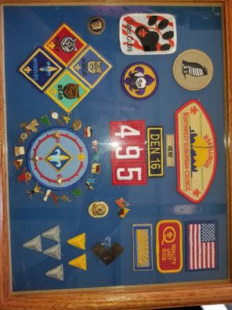 Collection of boys scouts badges and pins. Framed. Asking $50 obo.