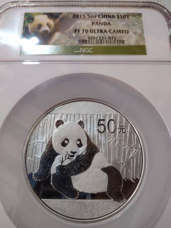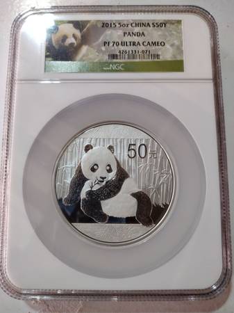 Beautiful coin, new in the original mint slab case. 2015 5 oz China S50Y Panda, PF 70 Ultra Cameo silver coin NGC - 5 oz fine silver. Serious inquiries only please, selling for $425, price is firm. Located In Aurora for pick up, contact Joe at show contact info
