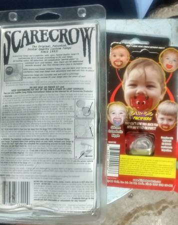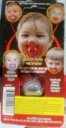 Pacifier for Baby and Fangs for Mom. The single 2 Fangs temporarly glue in. $10 for both. For pickup.