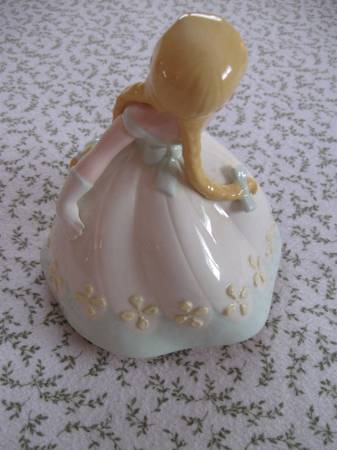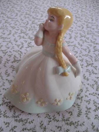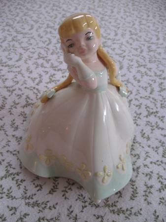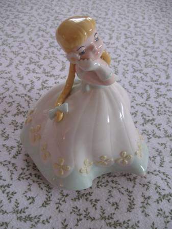 This is a very beautiful vintage unmarked girl porcelain figurine with long golden pig tails. She is 7" tall by 7" in diameter. The colors are very bright and she is in excellent condition ( no scratches/defects ) . Cash at time of pick up.