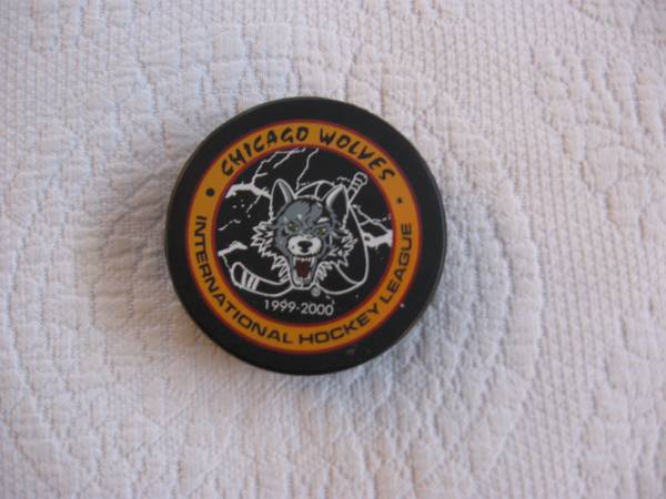 International Hockey League Chicago Wolves 1999-2000 official licensed product by Puck World . Hockey puck is 3" in diameter and 1" thick, in very good condition and cash at time of pick up.