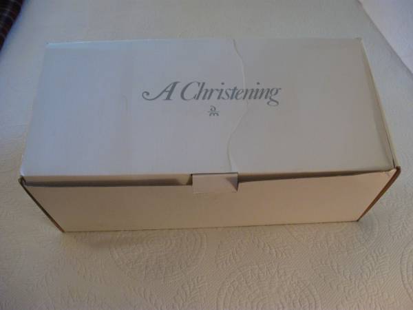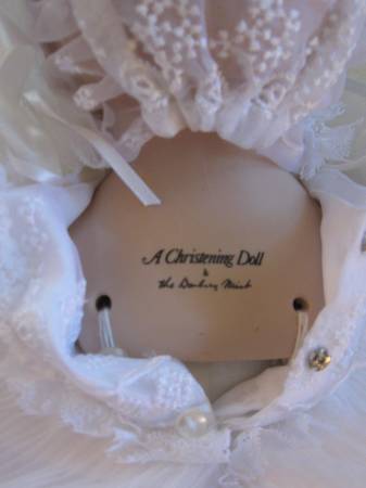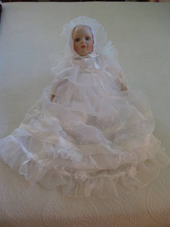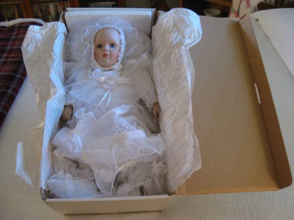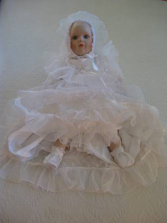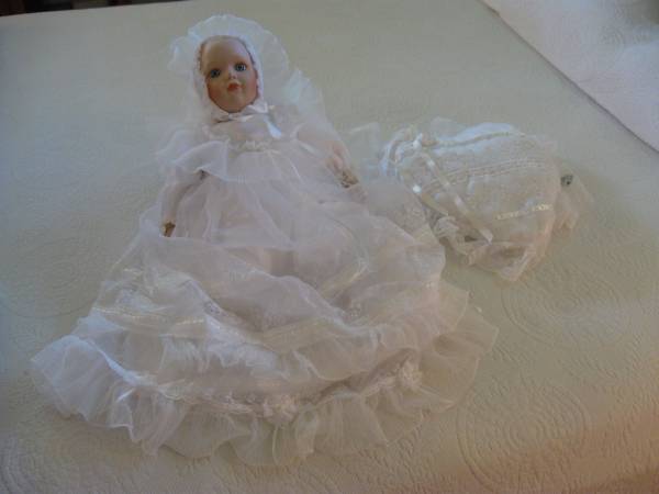 A very beautiful vintage bisque porcelain 1986 Danbury Mint A Christening Doll with a matching braided and embroidered heart shaped pillow that is 15" long by 15" wide.The doll is 20" long and the doll from the top of her head to the bottom of her dress is 28" long. Delicate porcelain features( head,hands & feet ), a fabric body, stunning blue eyes, a beautiful satin & lace gown, a tiny heart shaped gold bracelet, satin like booties and a matching bonnet. She is marked on the back of her neck Danbury Mint and comes in the original Danbury Mint box that is 9" tall by 11" wide by 22" in length.Everything is in very good condition and cash at time of pick up.