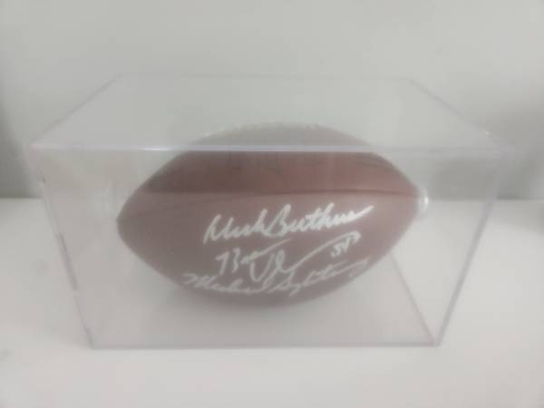 NFL football signed by Dick Butkus, Mike Singletary and Brian Urlacher. In a case with certificate of authenticity.