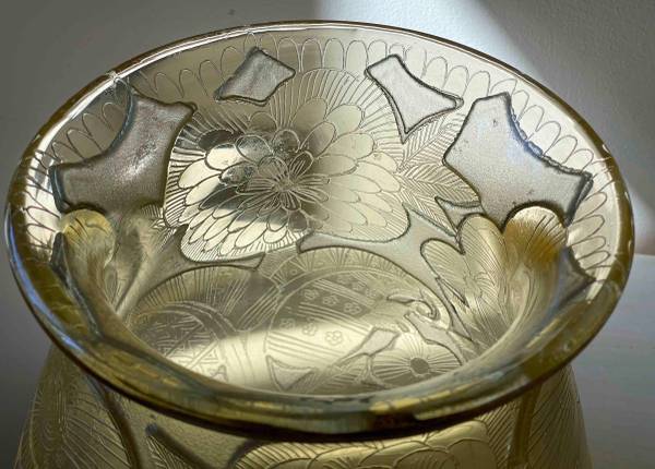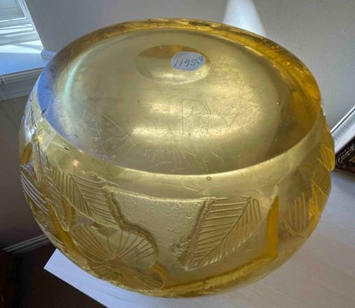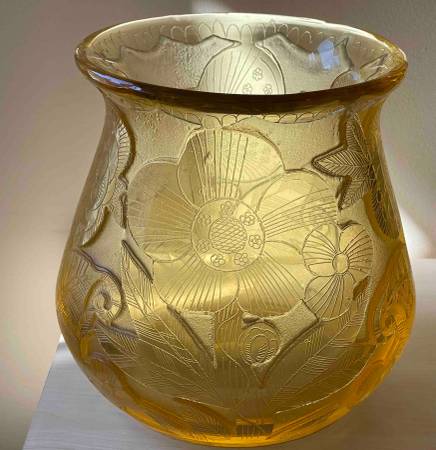 Moser yellow cameo glass vase-c.1930. Heinrich Hussmann. Stunning. Small micro chips on rim (almost imperceptible). 8” x 8” with 24” circumference. Weight about 5 lbs.