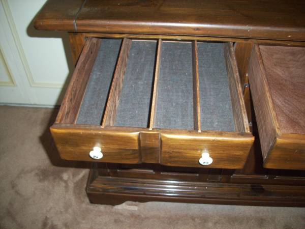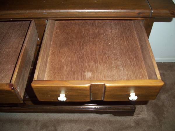 THIS IS A BEAUTIFUL ETHAN ALLEN - ANTIQUED PINE "OLD TAVERN" MODEL CHINA CABINET (2-PIECES). THE CHINA CABINET SEPARATES INTO 2-SECTIONS. THE LOWER CABINET SECTION INCLUDES 3-DRAWERS AND 3-STORAGE...
