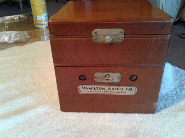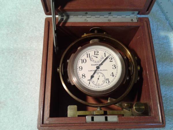 Hamilton WW2 ships chronometer used by US navy for it's accuracy circa 1941-2. Made in USA Lancaster Pa. very nice condition with both inner and outer boxes with original locking key runs and keeps good time. This is a nice one only issue is the leather strap for outer box and can be replaced see pics for condition. Cash only no trades ! Meet at Westchester police station. $2750 OBO