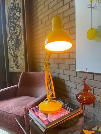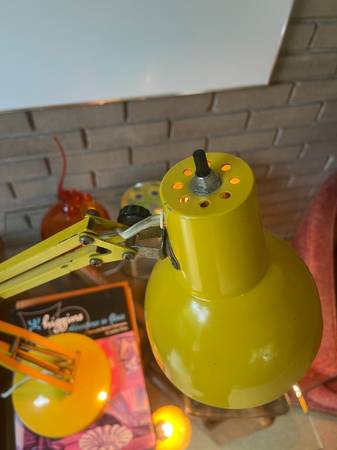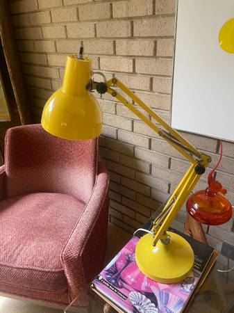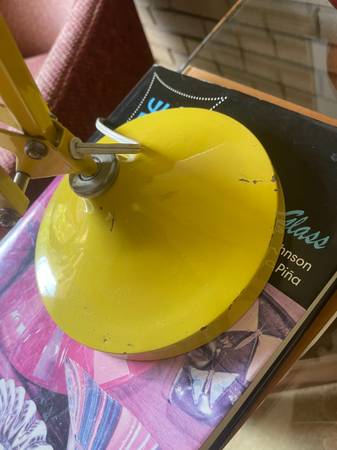 Super cute vintage articulated yellow metal desk lamp, fair condition. Needs some TLC and rewiring.