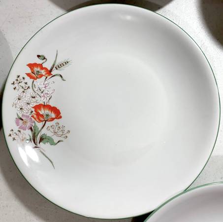 - 6 (Six) 9.5" Dinner plates - white with green rim - 2 orange poppy flowers & 1 pink flower on 1 side